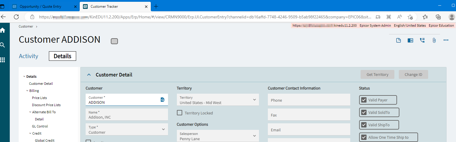 https://database/KinEDU11.2.200/Apps/Erp/Home/#/view/CRMN9000/Erp.UI.CustomerEntry?channelid=db16affd-7748-4246-9509-b5ab98f22465&company=EPIC06&site=MfgSys&pageId=Details&KeyFields.CustID=Ace%20Brown&pageChanged=true