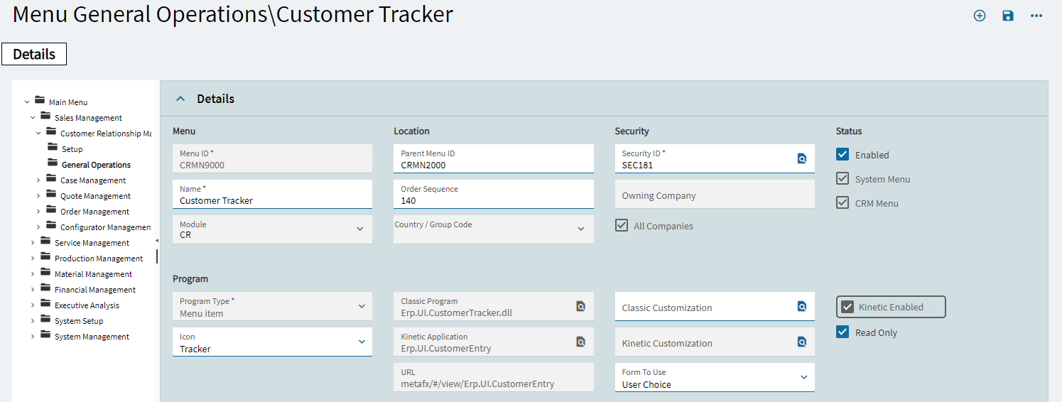 (https://<database>/<environment name>/Apps/Erp/Home/#/view/<MenuID CRMN9000>/Erp.UI.CustomerEntry?<channelid= some string db16affd-7748-4246-9509-b5ab98f22465>&company=<Company ID EPIC06>&site=<SiteID MfgSys>&pageId=Details&KeyFields.CustID=<CustID ADDISON>&pageChanged=true)